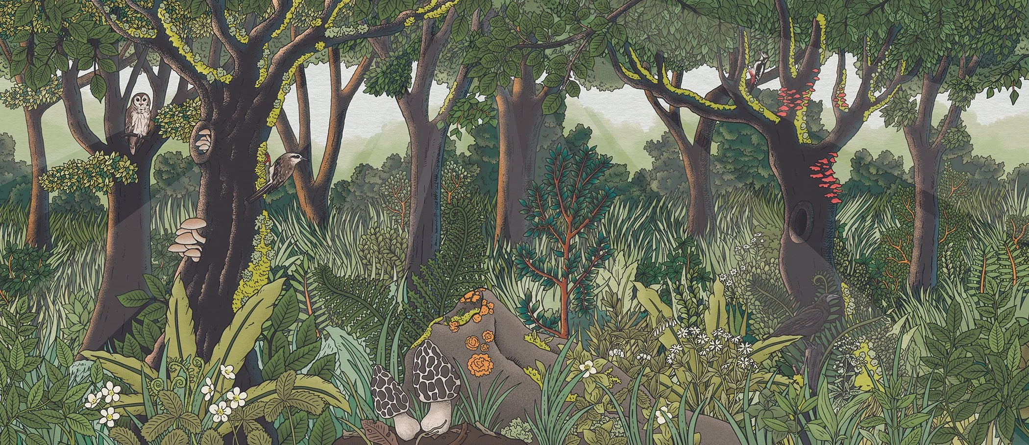 The Lost Elms book coverLight falls softly through layered leaves, catching moss, fungi, and bark worn by time. Birds linger in the hush, and every root and frond seems to listen.
